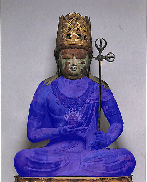 それぞれ違った色の彩色がされていて、密教で使用される五色(青、赤、白、黒、黄)に体の部分が色分けされている。